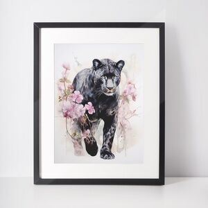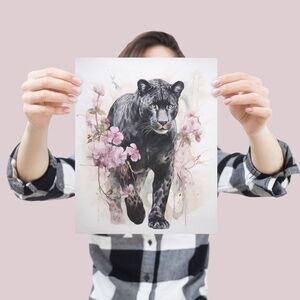 Transform your space with the captivating Watercolor Black Jaguar with Flowers Wall Art Print, a stunning fusion of wild beauty and artistic sophistication. This unframed print features a striking watercolor illustration of a black jaguar, capturing its sleek form and intense gaze with vibrant, fluid hues. Perfect for modern, bohemian, or rustic interiors, this artwork adds a bold yet elegant touch to living rooms, bedrooms, offices, or entryways. Crafted on premium archival-grade paper, it ensures vivid colors and exceptional durability. Available in multiple sizes, this print is easy to pair with your favorite frame for a personalized look. Bring the untamed allure of the jungle into your home with this exquisite jaguar portrait!