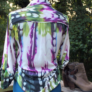 Utility straps with gold button detail for 3/4 sleeve. Purple & green tie-dye watercolor print. Pleated back.