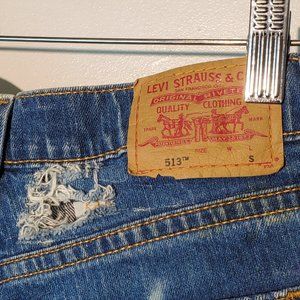 Upcycled hand-distressed watercolor shorts made from a pair of Levi's Low Slouch Stretch. One of a kind.