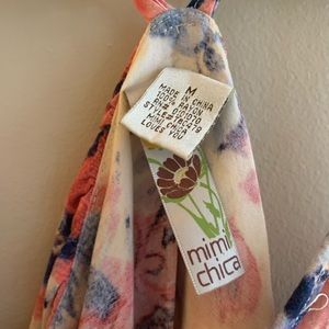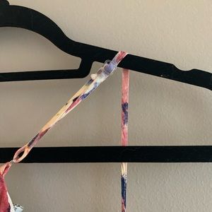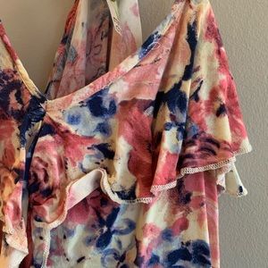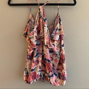 Pretty “watercolor” floral print tank with ruffle at top and down the middle.
