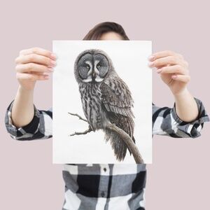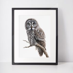 Step into the serene majesty of the northern wilderness with this captivating watercolor portrait of a Great Grey Owl, its piercing eyes and intricate feather patterns rendered in lush, flowing strokes. This unframed print features a vibrant watercolor illustration of a Great Grey Owl, capturing its commanding presence and ethereal plumage in rich, evocative hues. Perfect for rustic, modern, or nature-inspired interiors, this artwork adds a stately yet tranquil touch to living rooms, bedrooms, offices, or cozy nooks. Crafted on premium archival-grade paper for vivid, fade-resistant colors. Pair it with your favorite frame for a custom look and let this majestic owl bring a whisper of forest grandeur to your home!