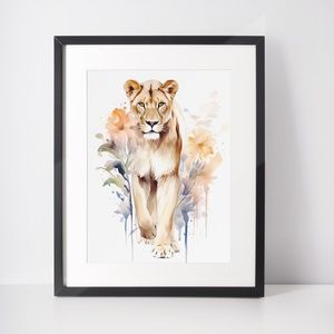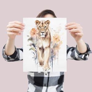 Watercolor Lioness With Flowers Portrait Wall Art Illustration Print Unframed