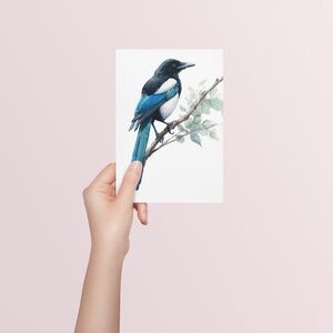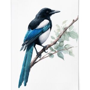 • Elegant Design: Stunning watercolor depiction of a graceful magpie bird.