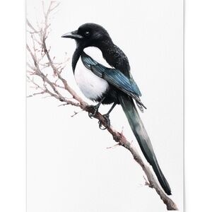 • Elegant Design: Stunning watercolor depiction of a graceful magpie bird.