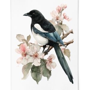 • Elegant Design: Stunning watercolor depiction of a graceful magpie bird.