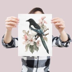 Bring a touch of nature’s elegance to your home with this enchanting Watercolor Magpie Bird on Branch with Flowers Wall Art Print. This unframed masterpiece captures a striking magpie perched gracefully on a branch adorned with delicate flowers, rendered in vibrant watercolor hues that highlight the bird’s iconic plumage and the blossoms’ soft beauty. Perfect for bird enthusiasts and art lovers, this high-quality print is crafted on premium archival paper for lasting vibrancy and durability. Its versatile design complements a variety of interior styles, from modern to rustic, making it an ideal addition to living rooms, bedrooms, or offices. Elevate your decor or gift this captivating piece to someone special.