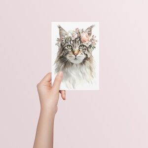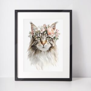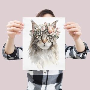 Add a touch of whimsical charm to your space with this stunning watercolor Maine Coon cat print, featuring a delightful feline adorned with a vibrant flower crown. This unframed artwork captures the playful yet elegant essence of the Maine Coon cat, with its sleek coat and soulful eyes beautifully accented by a colorful crown of blooms. Perfect for cat lovers, boho decor enthusiasts, or anyone seeking unique wall art, this print brings warmth and personality to bedrooms, living rooms, nurseries, or cozy home offices. Printed on high-quality, archival-grade paper with eco-friendly inks, it ensures lasting vibrancy and durability. Pair it with a frame of your choice to create a custom piece that celebrates feline grace and floral beauty. This artwork is a must-have for stylish, pet-inspired home decor or as a thoughtful gift for animal lovers.