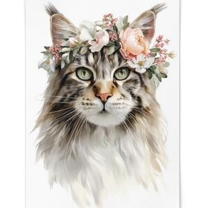 Watercolor Maine Coon Cat with Flower Crown Wall Art Print Unframed