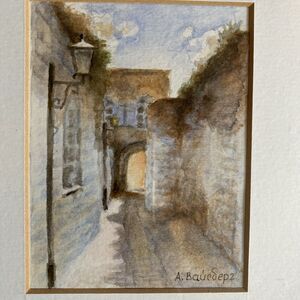 The product is a Watercolor painting that measures 8x10 inches and features a street scene. It is matted and framed, adding a touch of elegance to the artwork. The painting is signed by the artist A Bau, adding a personal touch and potentially increasing its value as a collectible piece. Please see pics for condition