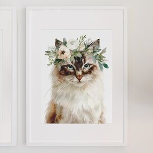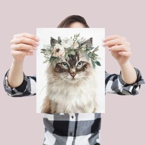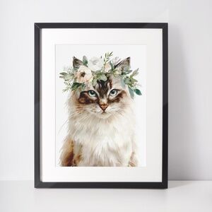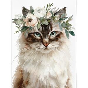 Watercolor Mink Ragdoll Cat with Flower Crown Wall Art Print Unframed