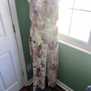 A lovely set for a lovely summer occasion! Here we have lightweight pant set in a watercolor/multi-color design. The top is sleeveless with a high neck that ties in the back. The bottom of the top is banded to keep the top lightly tapered to your waist. The wide leg pants are easy breezy with a wide waist band. This set follows Forever 21's plus size chart: