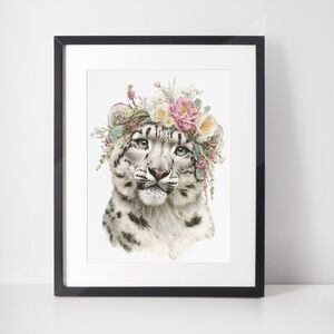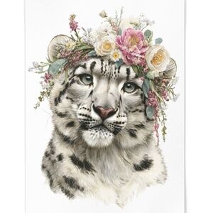 Transform your space with the mesmerizing beauty of this Watercolor Snow Leopard with Flower Crown Portrait Wall Art Print, a captivating blend of wild elegance and bohemian flair. This unframed print showcases a stunning watercolor illustration of a snow leopard adorned with a vibrant flower crown, its piercing eyes and sleek fur accentuated by delicate floral hues. Perfect for bohemian, modern, or nature-inspired interiors, this artwork adds a whimsical yet majestic touch to living rooms, bedrooms, offices, or cozy nooks. Crafted on premium archival-grade paper for vivid, fade-resistant colors, it’s available in multiple sizes to fit your decor. Pair it with your favorite frame for a custom look and let this enchanting snow leopard elevate your home!
