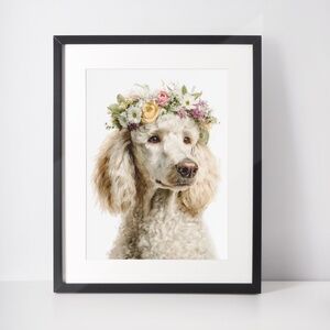 Elevate your decor with this Watercolor Standard Poodle with Flower Crown Wall Art Print, a delightful blend of canine sophistication and bohemian charm. This unframed print showcases a vibrant watercolor illustration of a Standard White Poodle adorned with a colorful flower crown, its graceful stance and lush coat accentuated by delicate floral hues. Perfect for modern, bohemian, or pet-inspired interiors, this artwork adds refined whimsy to living rooms, bedrooms, nurseries, or offices. Printed on premium archival-grade paper for lasting vibrancy, it’s available in multiple sizes. Pair it with your favorite frame for a custom touch and let this elegant poodle shine!