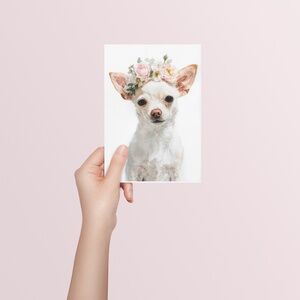 Watercolor White Chihuahua with Flowers Portrait Wall Art Print Poster Unframed
