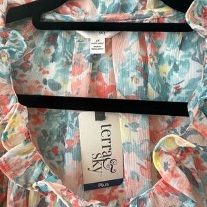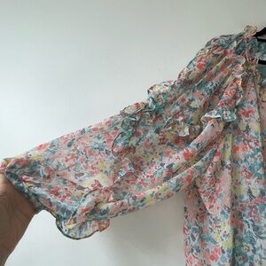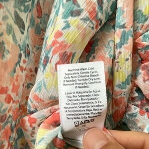 Sweetest blouse with beautiful springy colors and watercolor floral design.
