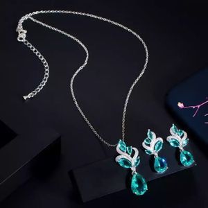 Pera Elegant Korean Style Light Blue Cubic Zirconia Women Fashion Pendant Leaf Necklace Water Drop Earrings Jewelry