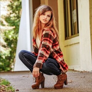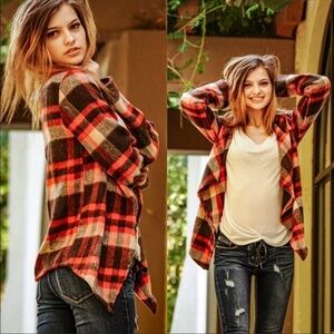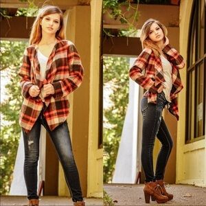 Adorable orange and brown flannel shacket/cardigan. Perfect layering piece for transition weather. Brand new item, never been worn. Material: 55% Cotton, 45% Polyester.