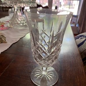Waterford Araglin (produced from 1987-2021; since discontinued) crystal footed ice tea glasses - 16 available; this listing includes two glasses (others for sale as well). 15 are in pristine condition, including two in photo; one has small chip. There is also a photo of the Waterford stamp - difficult to see because of size, but is on each glass.