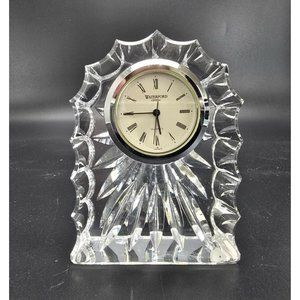 This vintage Waterford crystal mantle clock features an elegant design with Roman numerals. Its intricate cuts reflect timeless craftsmanship, adding sophistication to any setting.