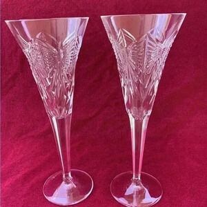 A pair (2) Waterford Crystal "The Millennium Collection" crystal 1st Toasting - Happiness toasting flutes. The flutes are flared in form with a large bow designs to the elongated bowls, tall slender stems, acid-etched to the verso with the Waterford logo. In EXCELLENT pre-loved condition! No chips or cracks. Family Keepsake! (Original box not available.) HAPPINESS - LOVE - HEALTH - PROSPERITY - PEACE