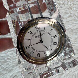 Small Waterford Crystal Clock. Beautiful, pyramid style, with a hole in the front in which the clock face pops in and out to change the battery. Takes a watch battery, the one inside it now is dead and I have not replaced it.