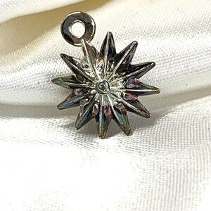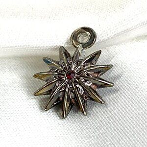 This intricate silver "Snowflake Wishes" charm by Waterford Crystal, adds elegance to any piece of jewelry. This pretty charm features a shiny silver rhodium plating with a tiny, sparkling, ruby red crystal gem at its center. Its compact size of 5/8" is ideal for necklaces or bracelets, making it a versatile and timeless addition to your collection. A limited edition charm that combines beauty and sophistication. Very good preowned condition with a beautiful patina. See photos.