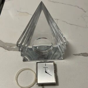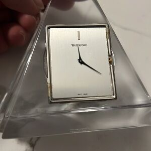 This is a great Waterford Crystal Triangle Pyramid Mantle Desk Clock. Has a hairline chip at the very base that is unseen you can only feel it if you glide your finger under it. 3.75” high by 4” wide 2” deep. It does need a new battery