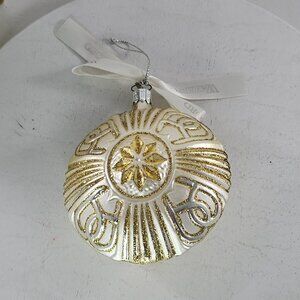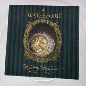 A collectible glass ornament featuring intricate Celtic cross design with gold and white accents, part of Waterford's Nostalgic Collection.
