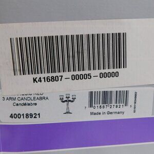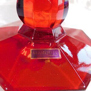 This is a Waterford Marquis three arm candleabra in red. It is new in the box with a purple Waterford sticker and a Waterford bar code sticker on the base as shown.