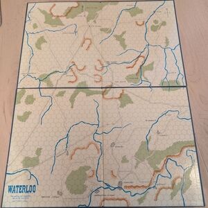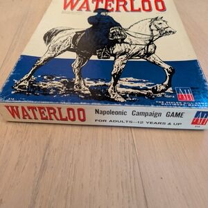 Waterloo board game set with detailed instructions and reference sheets. Refight the last great campaign of Napoleon, in this fast-moving game of military strategy. Over 160 die-cut counters representing the massed armies of France, Prussia, and the Dutch Anglo-Allies maneuver and engage in combat on a full-color, 22" x 28" mapboard.