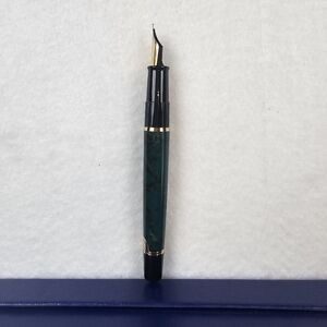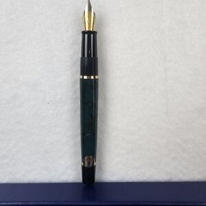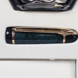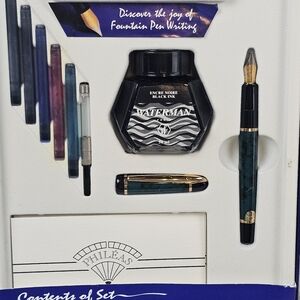 The Waterman Phileas FP Set in Green Marble with Gold Trim is a luxurious fountain pen featuring a medium-sized stainless steel nib. This collectible pen from France comes with a multicolor ink bottle and refills. The gold trim adds a touch of elegance to this Waterman pen, making it a sought-after item for pen enthusiasts and collectors alike. Pen Collector Enthusiast Letters NOS Gift Box Art Deco Home Office Corporate Decorative Collegiate Professor Writing Expert Corporate Watercooler Boss Nostalgia Desk Decor Decoration Writing Enthusiast