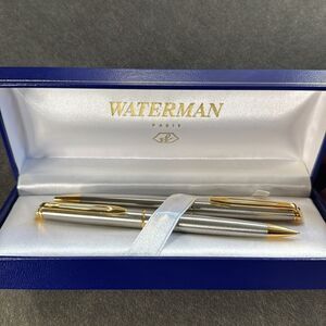 Waterman Stainless Steel Ball Point Pen & Pencil Set Silver Gold Trim Medium NEW