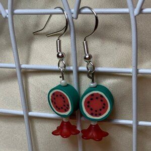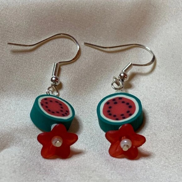 This matching set of earrings is made with a clay watermelon bead and a red flower at the bottom with pearl seed beads in between. Fun and adorable touch to any outfit!