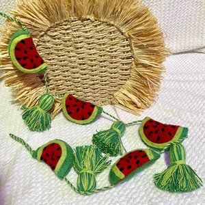 This garland has a green-striped rope for a base that is strung with tassels and watermelon shapes. The tassels are constructed from the same two-toned green rope, while the watermelons are made from wool fabric. Use the loop at each end of the tassel to hang this garland on your wall, table edge, or mantel.