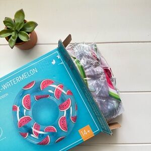 Colorful inflatable pool tube with a fun watermelon design. Perfect for poolside relaxation.