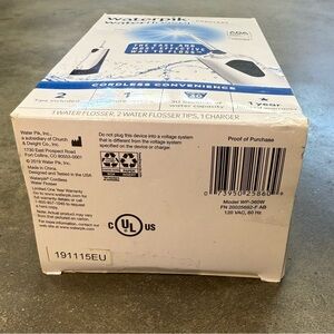 Open box, never used. Complete with cordless flosser unit, reservoir, 2 tips, charging adapter, and original box. Item has been removed from packaging for photos only. Excellent condition — ships fast and securely.