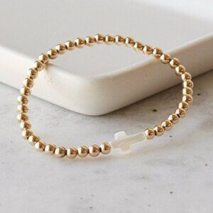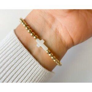 Waterproof Cross Bracelet Pearl Cross Gold Non-tarnish Beaded Stretch Bracelet