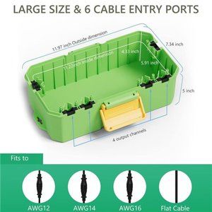 🧿【Large Space & Wide Compatibility】The waterproof extension cord connection box are 11.97 x 7.34 x 5 inch, which are enough to accommodate and protect your power strip, timer outlet, bulky adapter and more electrical connections. The 6 seal cable entry ports are all compatible with AWG12/14/16 cord, flat cable and braided wire.