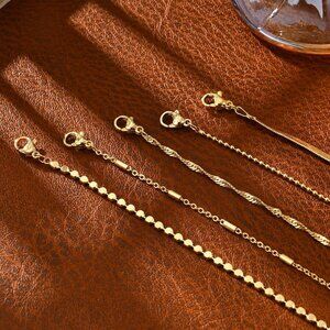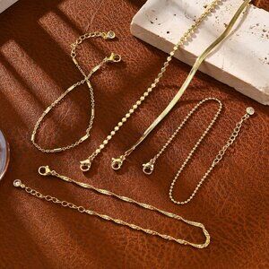 Features: This stunning set includes five different dainty gold bracelets—bead chain, snake chain, wave twisted rope, flat oval chain, and small bar chain. Each piece shines with a luxe high-polish finish and layered for a stylish, lightweight stacked look perfect for daily wear or special occasions.