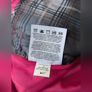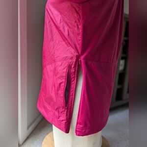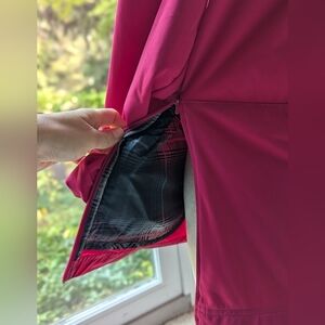 Features elastic cuffs, waterproof shell material, is lined and has two large pockets on either side of garment.