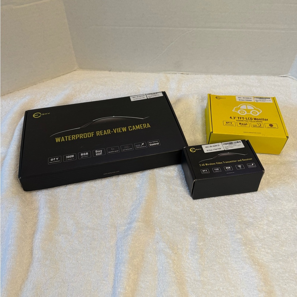 Waterproof rear-view camera with 4.3" TFT-LCD monitor. Includes additional transmitter and receiver kit. Sleek black and vibrant yellow packaging.