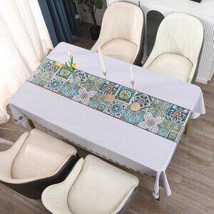 Enhance your dining experience with this stylish medallion runner print tablecloth. It offers excellent protection against spills and stains, ensuring easy maintenance. Perfect for both indoor and outdoor settings. Heavy duty PVC. Multi-colored with gray and blue as the main color palate.