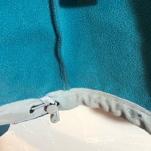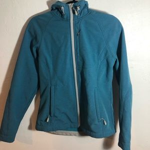 Blue zip up jacket. Synthetic water proof exterior and warm fleeced interior. Jacket is great for a colder day and can handle moderate precipitation. Worn only a few times and in excellent condition. (010)