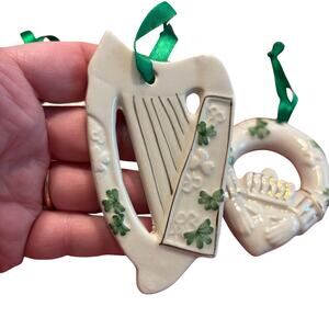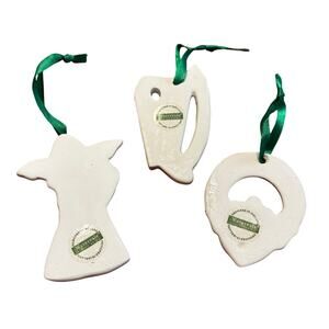 Watervale brand Porcelain Christmas ornaments - a lot of 3 all done in creamy white with tiny green shamrock details and golden highlights. All pieces are hallmarked parian china and designed in Ireland with bright green ribbon hangers attached. In excellent condition - ready to hang!