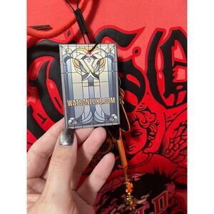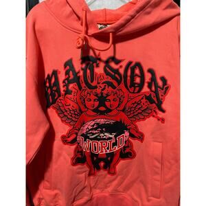 Keywords: Watson hoodie, Larger Than Life, Watson World, red graphic hoodie, cherub angel print, streetwear hoodie, skate style, unisex hoodie, NWT size large, bold graphic sweater, heavyweight fleece, casual fashion.