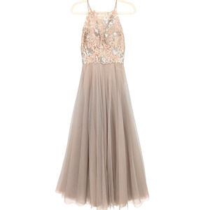 Stunning Watters bridesmaid/formal/event dress. This gorgeous full-length gown has a bodice fashioned from sequined Lucca lace over illusion netting and features a modified halter neckline and fine spaghetti straps to frame the low, semi-open back. The long skirt is gently shirred to create a lovely Bobbinet A-line silhouette as it flows in layers of soft bobbinet. Very comfortable and nice as it's form fitting up top, and forgiving in the stomach and hips area!