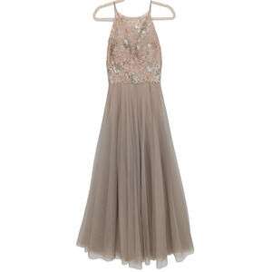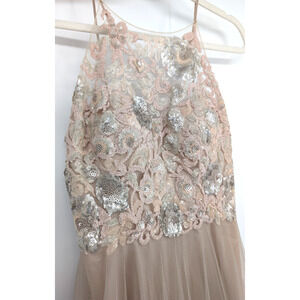 Stunning Watters bridesmaid/formal/event dress. This gorgeous full-length gown has a bodice fashioned from sequined Lucca lace over illusion netting and features a modified halter neckline and fine spaghetti straps to frame the low, semi-open back. The long skirt is gently shirred to create a lovely Bobbinet A-line silhouette as it flows in layers of soft bobbinet. Very comfortable and nice as it's form fitting up top, and forgiving in the stomach and hips area!