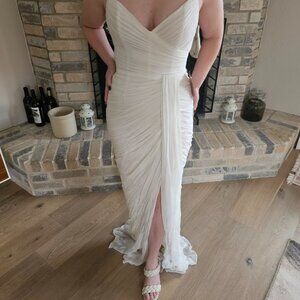 An enchanting sheath silhouette with a deep sweetheart neckline and textured folds, the idyllic Watters Lupine Wedding Gown blossoms with gentle draping, radiating a refreshing and feminine essence. A textured, ruched fabrication draws the eye to the striking strapless bodice, down to the fitted faux wrap waist, finishing with a striking front slit moment.