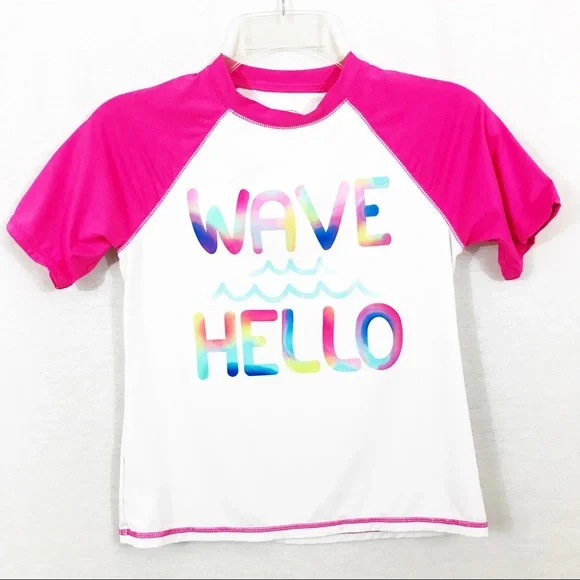 Rash guard features vibrant colors and “Wave Hello” message and graphic