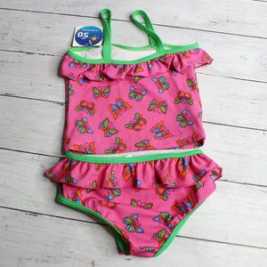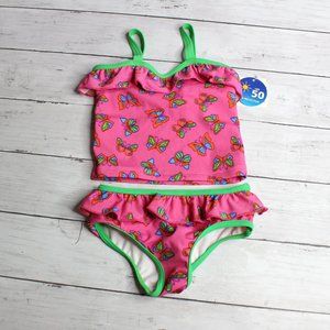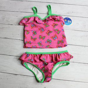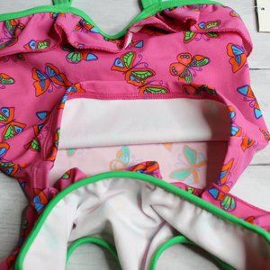 This two-piece swimsuit includes a tankini top with ruffle and coordinated swim bottoms. The fabric is pink, green, blue, and orange with butterflies. The set is lined and is really nice quality. It has UPF 50 UV sun protection. It is brand new with tags.